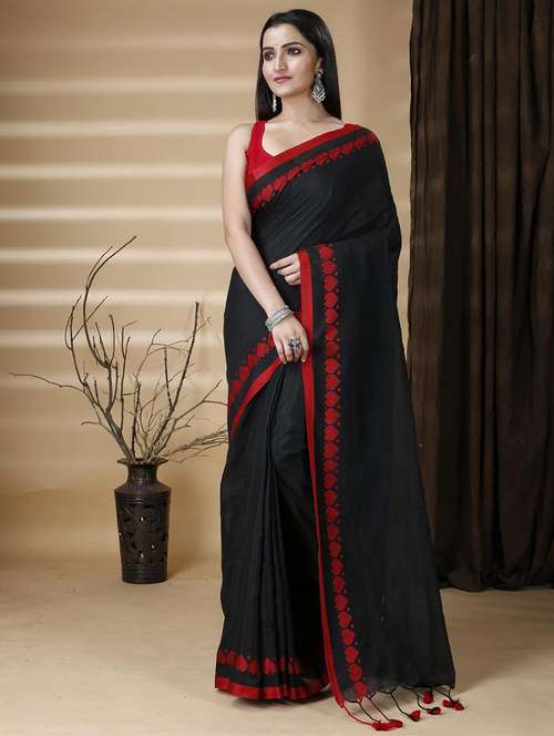 women solid with bordered handloom saree