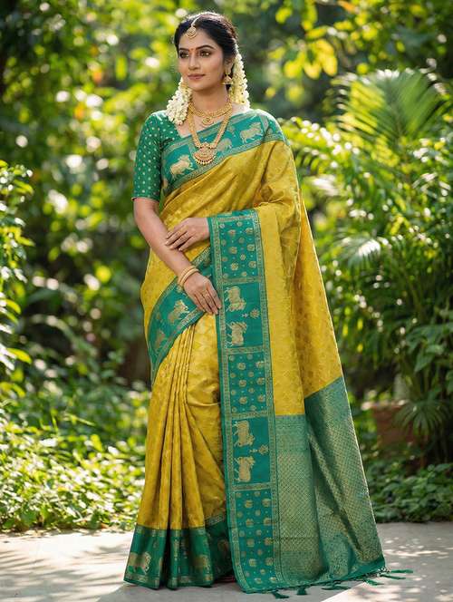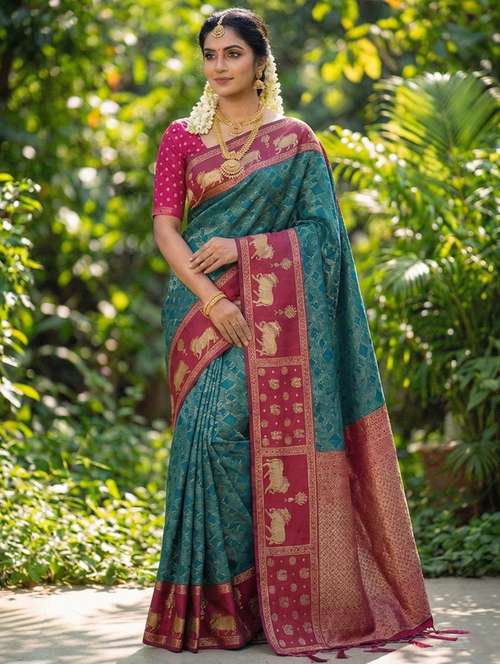 Design & Motif: Features a majestic Gold Zari \Nandi\ (Sacred Bull) Motif on the border and pallu, symbolizing strength and prosperity, inspired by traditional Temple jewelry.