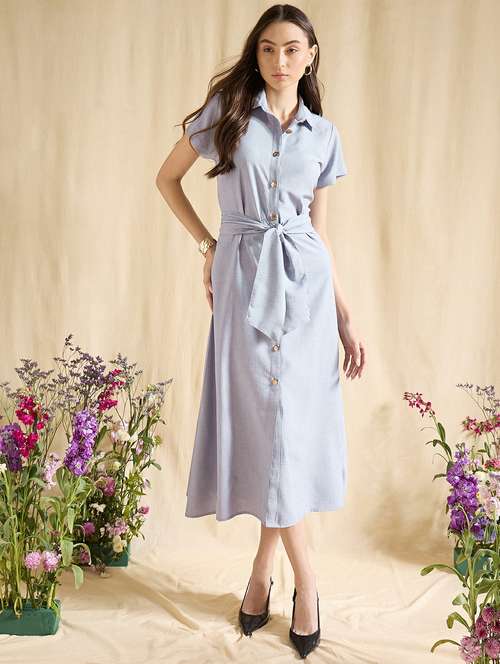 Upgrade your wardrobe with this elegant shirt dress for women by Drape and Dazzle, designed for modern women who love timeless style with comfort. Crafted from premium breathable cotton blend fabric, this blue midi dress offers a lightweight, soft, and skin-friendly feel, making it ideal as a summer dress for women. The classic shirt collar and button-down front add structured sophistication, while the adjustable waist tie belt enhances the silhouette for a flattering fit. The short sleeves and flowy midi length create a perfect balance of smart and feminine appeal, placing it among the most loved casual dresses, office wear dresses, and western dresses for women.