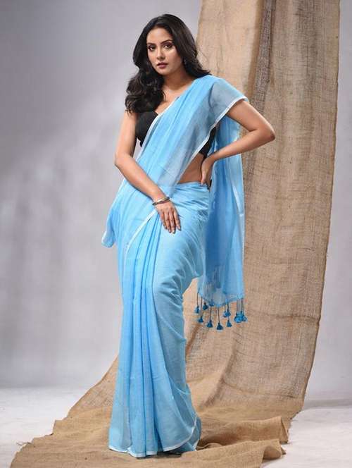 Look classy and posh in this sky blue cotton handloom saree. It has plain body with simplicity. The pallu is highlighted with pompom to complete the look.