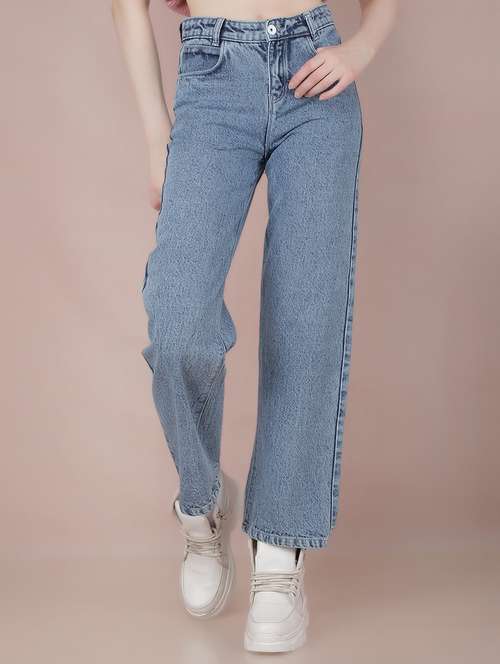 - Choose from the trendy assortment of wide leg jeans in a variety of light blue colors and timeless designs to complete your clothing essential list.