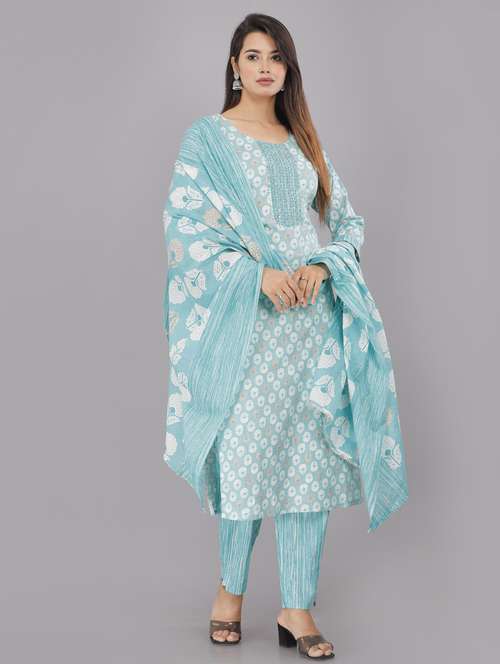 blue printed embroidered kurta pant set