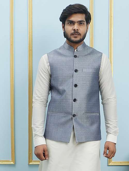 Men Off White Kurta Pajama And Blue Color Solid Woven Design Jacquard Nehru Jacket, Has a Mandarin Collar, Sleeveless, 3 Pockets Front And 1 Pocket Inside And Straight Hem