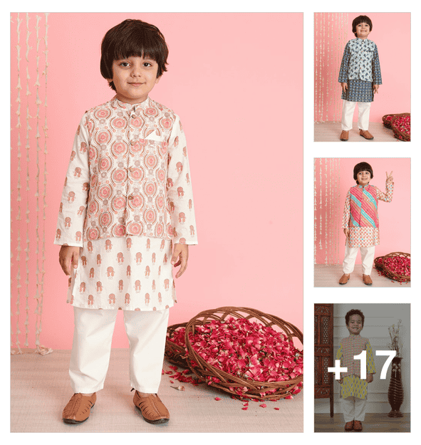 boys printed long sleeve kurta & pyjama set