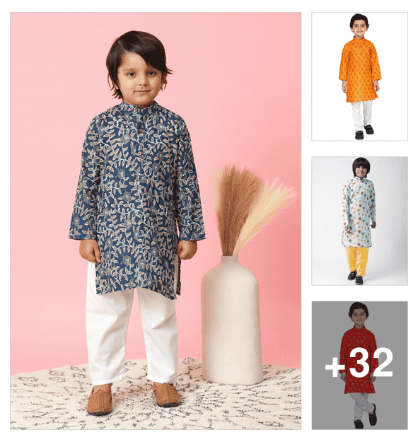 boys printed long sleeve kurta & pyjama set