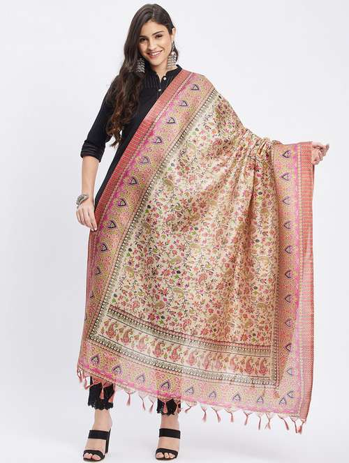 beige floral print dupatta with fringes