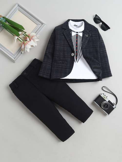 boys checkered blazer and trouser with t-shirt set
