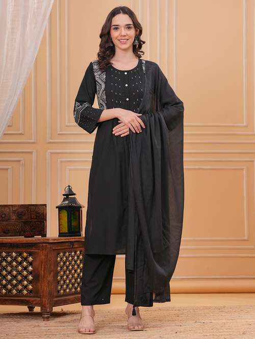 women solid with work round neck kurta pant with dupatta set