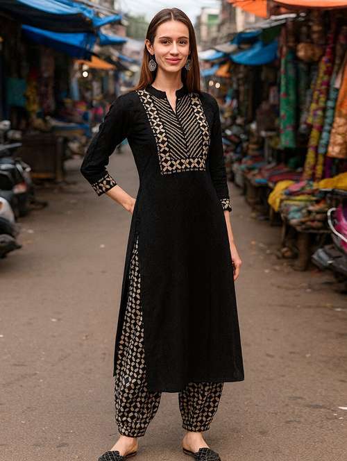 women printed three quarter sleeve kurta salwar set