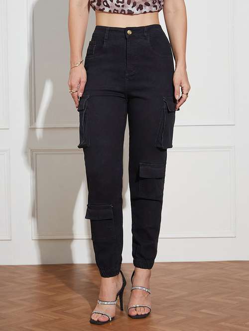 women solid high rise denim cargo