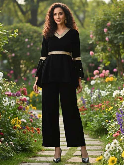 women solid with work three quarter sleeve kurta palazzo with dupatta set