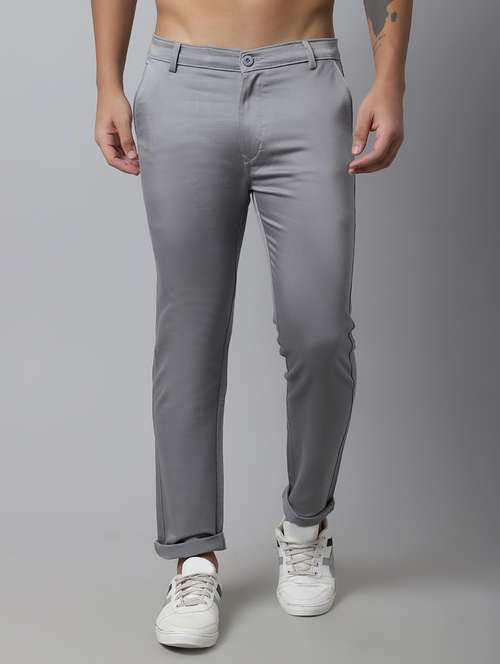 grey cotton flat front casual trousers