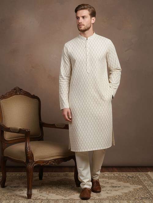 men printed mandarin neck long kurta