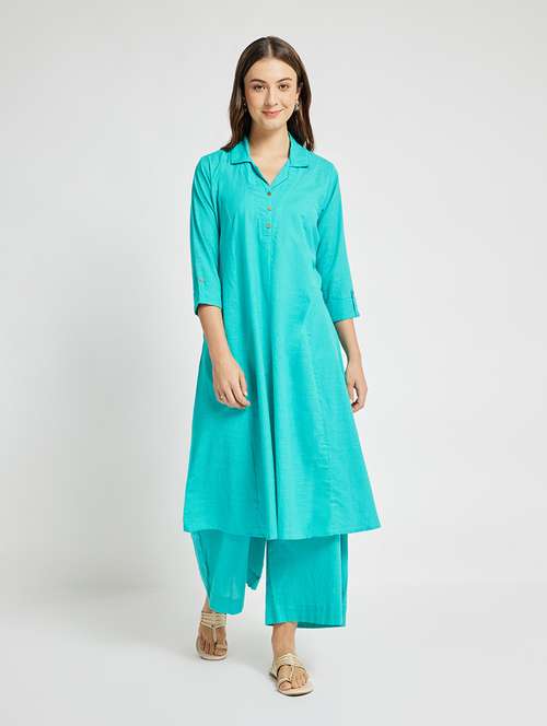 women solid three quarter sleeve a-line kurta