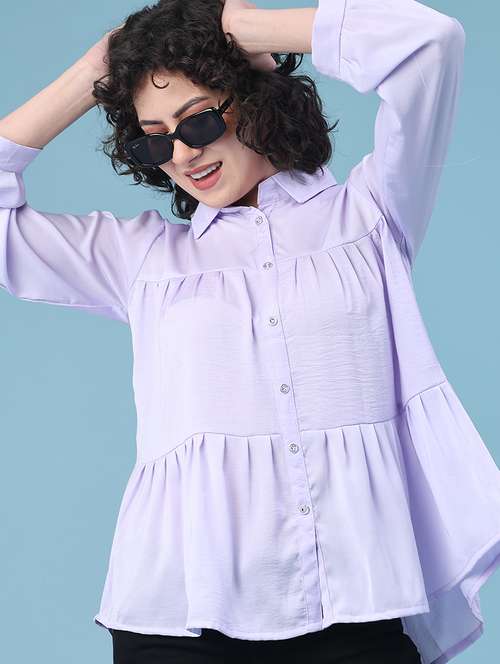women solid collared long sleeve tiered top