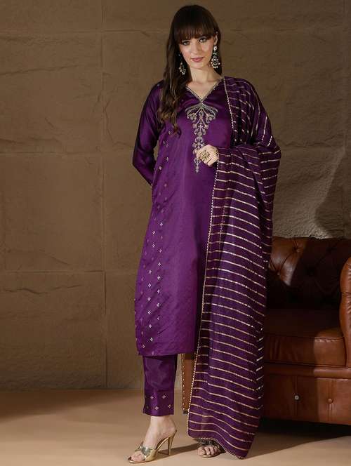 women solid with work three quarter sleeve kurta pant with dupatta set