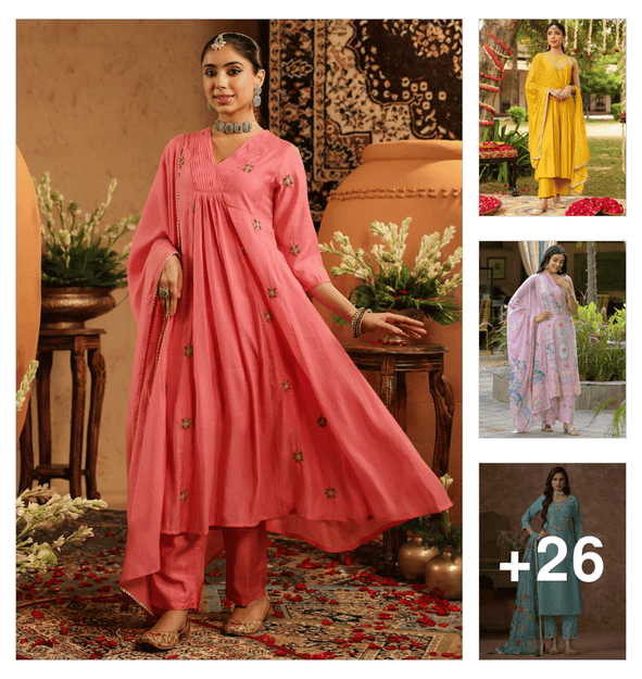 women three quarter sleeve anarkali kurta pant with dupatta set