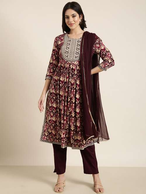 - Find gorgeous sets of ethnic wears in trending designs in burgundy colors suitable for festive wear of occasions.