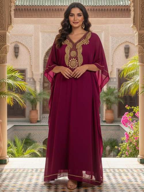 - Time to add comfortable layers to your style statement with embroidered pieces in your wardrobe and get kaftans in burgundy colours exclusively available on LimeRoad.