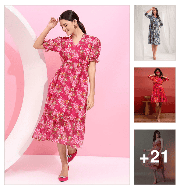 women floral print puff sleeve fit & flare dress
