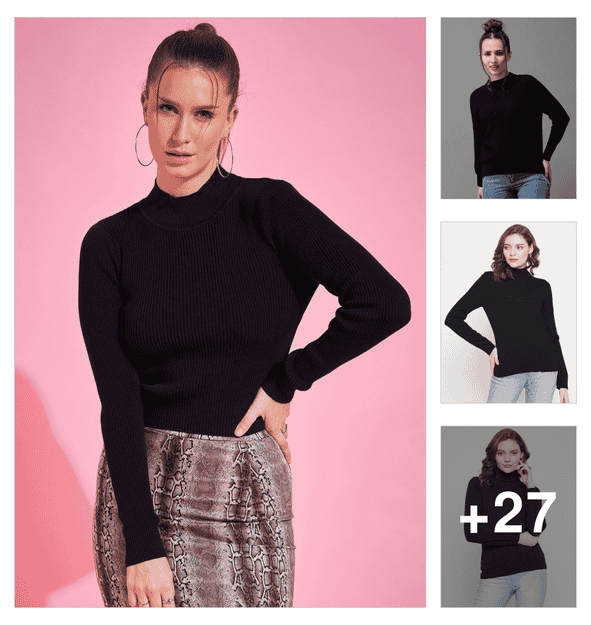 globus women black round neck long sleeves floral print ribbed hem winterwear pullover sweater