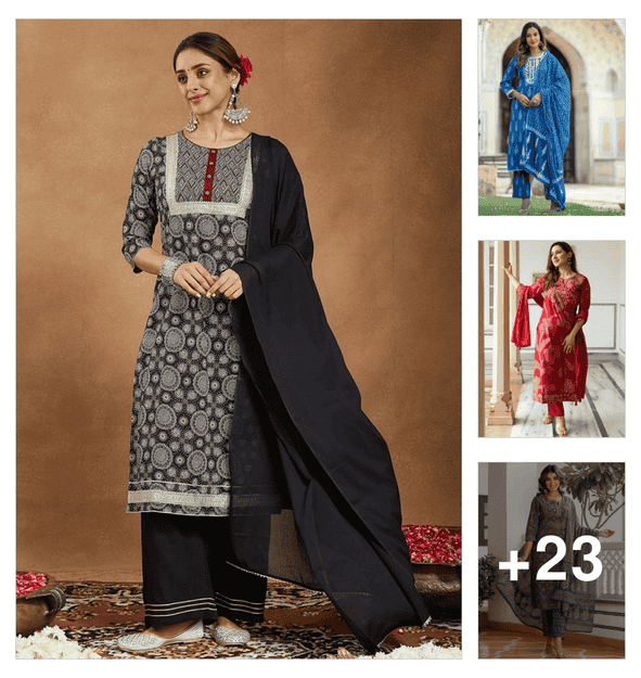 women printed long sleeve kurta palazzo set