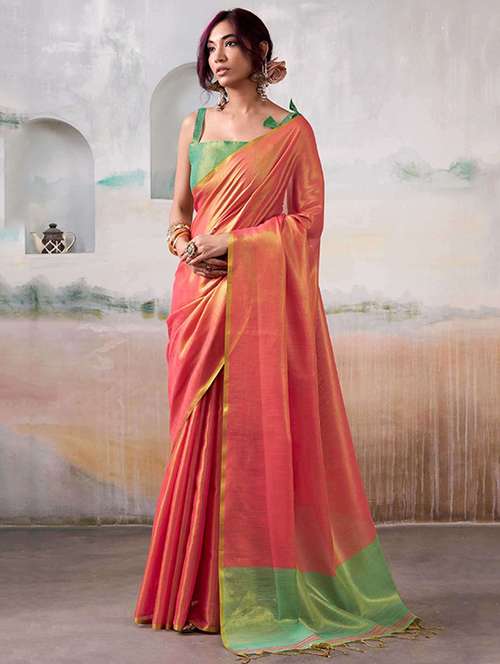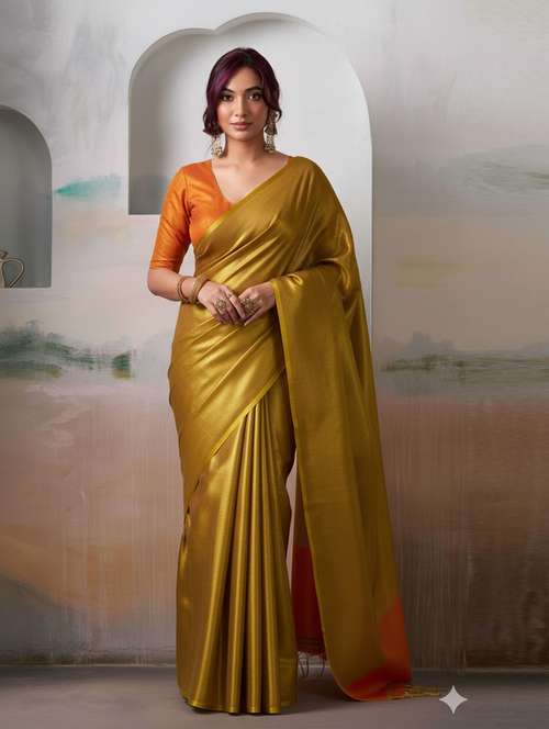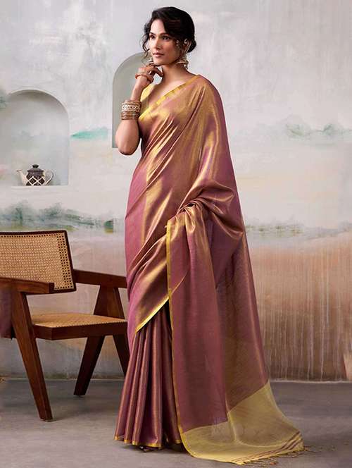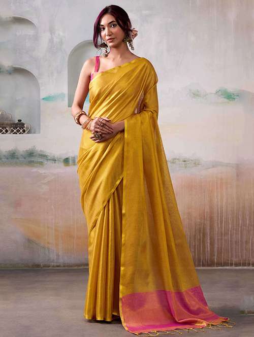 This graceful Golden tissue silk blend saree, adorned with intricate zari weaving and highlighted with a tassel-accented pallu for a refined traditional look. Made from a premium silk blend, the fabric is soft, lightweight, and airy, ensuring a graceful drape and all-day comfort. The saree comes with a matching unstitched blouse piece, giving you the flexibility to design it to your preferred style and fit. Perfect for weddings, festive gatherings, and cultural celebrations, this saree beautifully combines classic craftsmanship with modern elegance.
