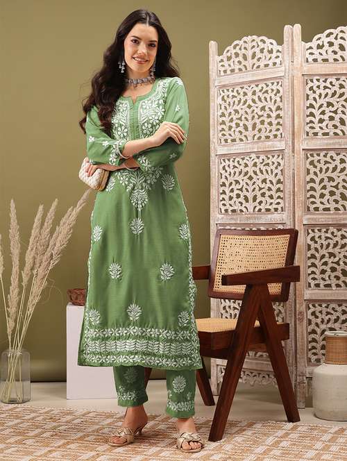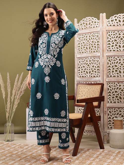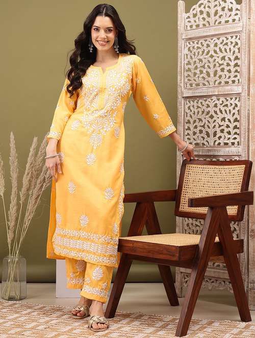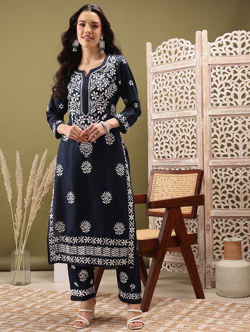 - Browse through the latest range of ethnic sets for women with tailored sleeve designs with chikankari works.