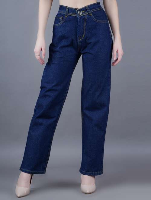 women solid high rise straight fit jeans