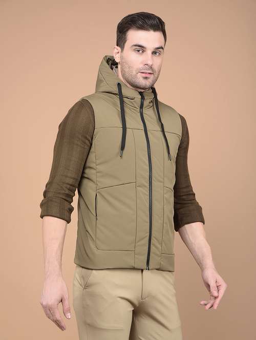 Crimsoune Club Men's Khaki Hooded Neck Sleeveless Jacket is crafted with premium quality materials, ensuring comfort, durability, and style. This piece is perfect for elevating your wardrobe with its trendy design and exquisite detailing.