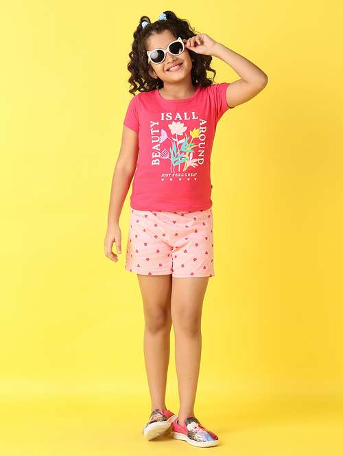 - » girls front printed round neck top & shorts set