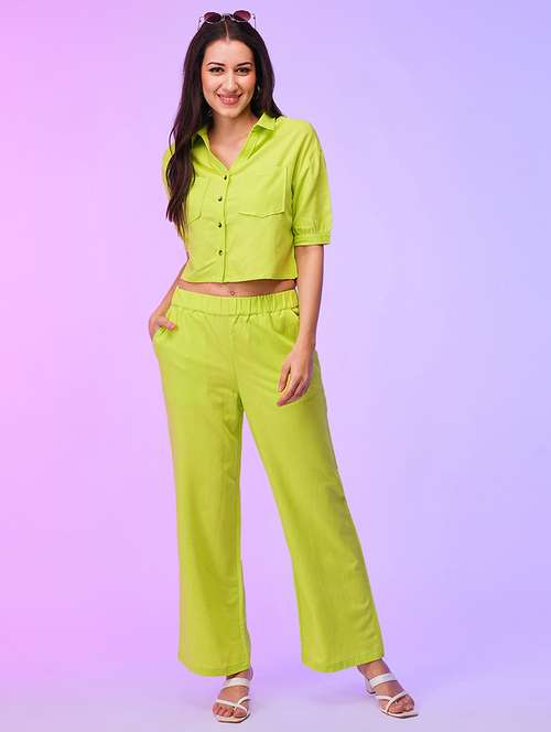 The Globus Women's Lime Shirt & Trousers Co-Ord Set is perfect for a casual, contemporary look. In a vibrant lime color, this set features a shirt with a relaxed, boxy fit, drop shoulders, and short sleeves, paired with matching trousers. Made from Viscose Rayon, it offers a comfortable wear, with easy slip-on trousers and a buttoned shirt, offering a total of four pockets.