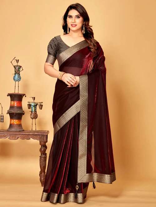 Make a bold and elegant statement with this rich purple silk saree, featuring a striking striped print in shimmering silver and gold. The saree is beautifully detailed with zari floral embroidery enhanced by intricate mirror work, while scattered floral motifs adorned with mirrors and stones add a festive sparkle throughout the drape. Completing the look is a matching purple silk blouse, intricately embroidered with floral patterns in zari and mirror work, perfectly complementing the saree’s ornate detailing. Ideal for weddings, receptions, or grand celebrations, this ensemble blends opulence with refined artistry.