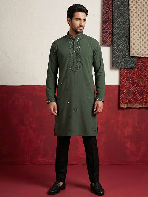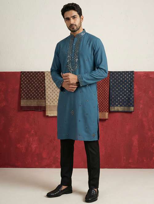 Japanese Fabric kurta set adorned with intricate embroidery and subtle mirror work detailing for a rich festive appeal. Designed with a mandarin collar and a clean straight silhouette, it offers a refined and elegant look perfect for celebrations and special occasions.
