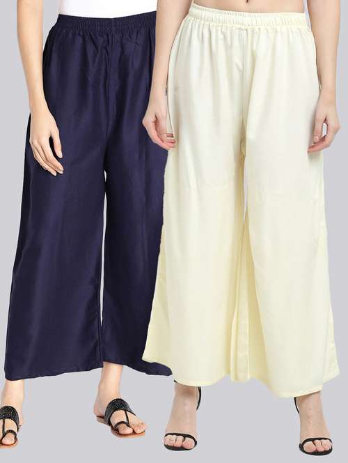 Pack of 2 Flared Women Cream and Navy Blue Viscose Rayon Palazzo