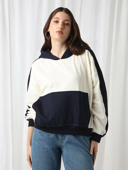 - » globus women navy blue colorblock drop shoulder sleeves kangaroo pocket hooded oversized sweatshirt