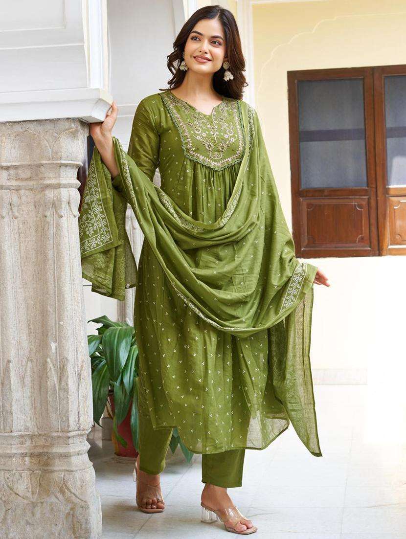 • Find gorgeous sets of ethnic wears in trending designs in green colors suitable for festive wear of occasions.