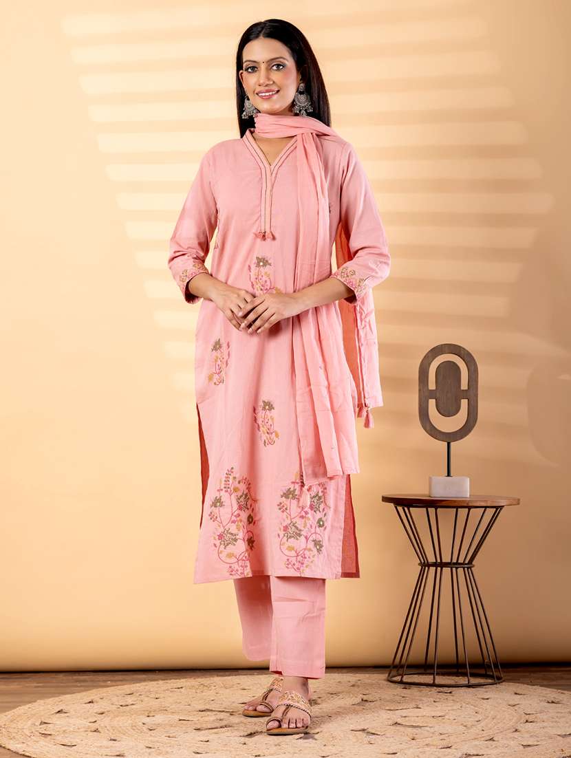 women solid with work three quarter sleeve kurta pant with dupatta set