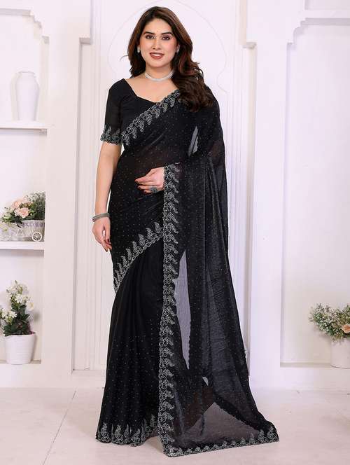 The highlight of this saree is its intricately crafted lace border, embellished with diamond-like stones or crystal embroidery. The shimmering accents on the border reflect light beautifully, adding a luxurious touch that catches attention while remaining tastefully elegant.