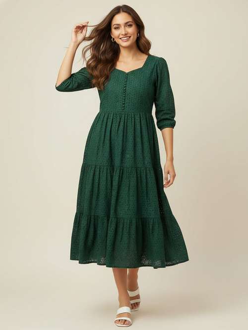 - Dress up in a soothing pattern and don this dress made of cotton material.