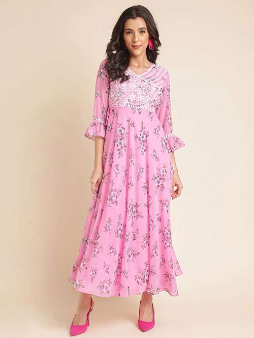 - Dress up in a soothing pattern and don this dress made of georgette material.