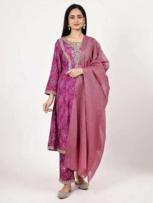 women bandhani printed long sleeve kurta pant with dupatta set