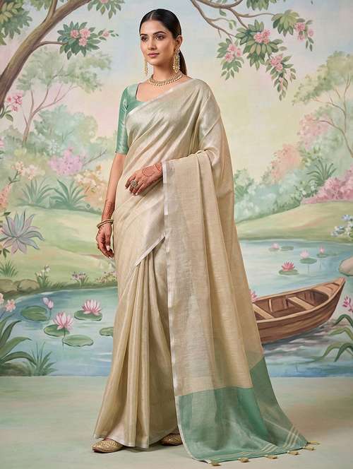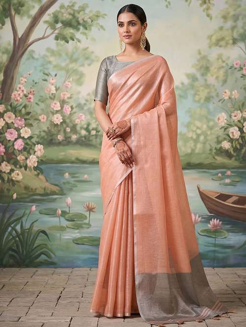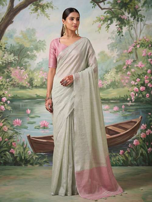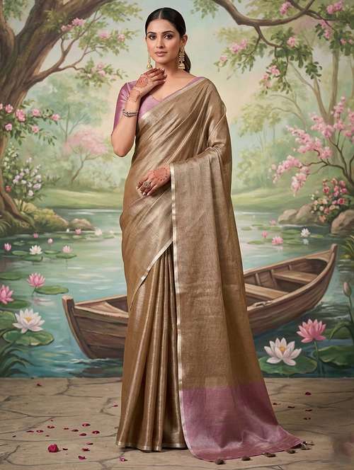 GreenSutriti Rose Pink Tissue Silk SareeGreenGreenGraceful Dual Tone EleganceGreenThis beautifully draped saree showcases a soothing rose pink body paired with a contrasting grey pallu that adds depth and sophistication. The fabric appears to be likely tissue silk, known for its lightweight feel and subtle metallic sheen that enhances the overall look. The saree flows effortlessly, creating a flattering silhouette that feels comfortable yet luxurious for extended wear. Its minimal yet refined design makes it a perfect choice for women who prefer understated elegance. Ideal for festive gatherings, weddings, and traditional celebrations, this saree blends modern grace with timeless charm. The soft texture and smooth drape ensure you feel confident and stylish throughout the day. Pair it with statement earrings and classic footwear to complete a polished ethnic look that stands out without being overwhelming.