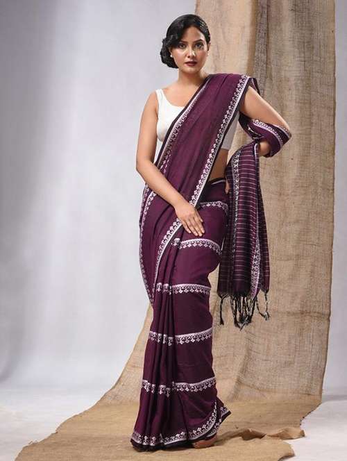 Charm up in your own brightness with this purple cotton handwoven saree. It has tample pattern stripes woven all over the saree along with pallu. The pallu is highlighted with stripes to complete the look.