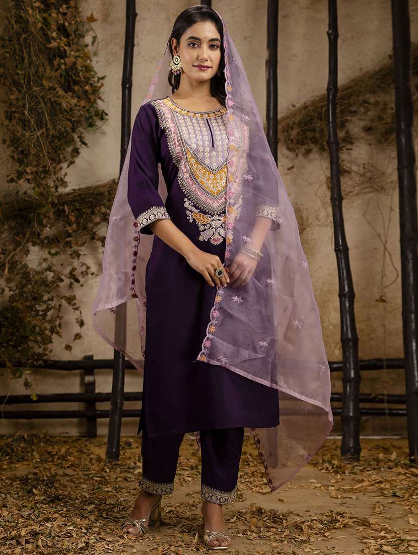 - Find gorgeous sets of ethnic wears in trending designs in purple colors suitable for casual wear of occasions.