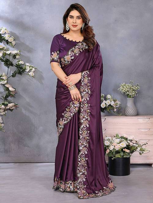 This deep wine satin saree is beautifully adorned with floral embroidery and elegant resham thread work, creating a refined and festive look. Made from premium satin fabric, it offers a smooth texture and graceful drape, ensuring comfort and charm. The saree is paired with an unstitched satin blouse piece, which can be tailored to your preferred design and fit.