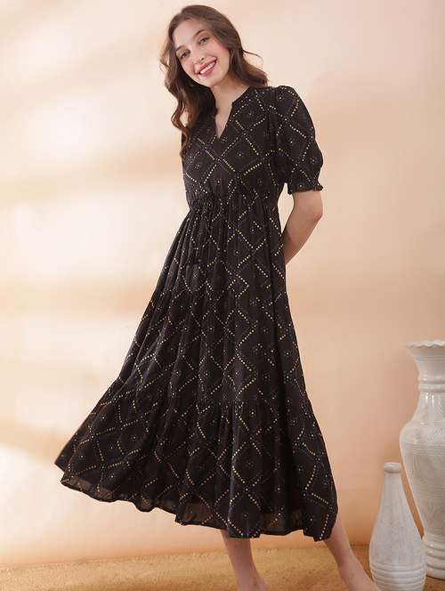 - » globus women red bandhani print mandarin collar puff sleeves waist tie-ups tiered fit & flare midi dress
