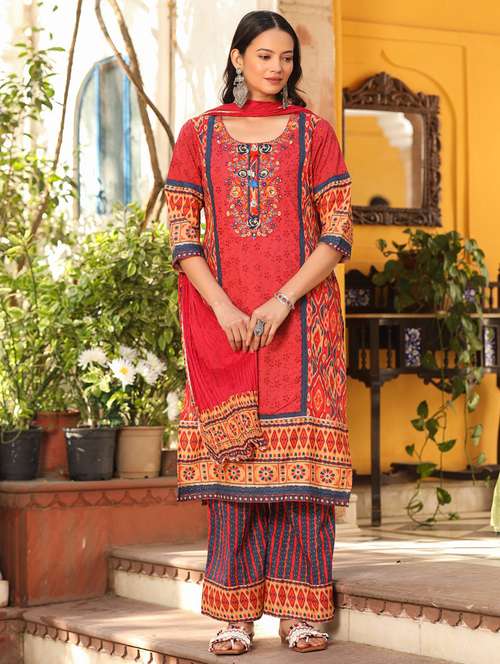 - Find gorgeous sets of ethnic wears in trending designs in red colors suitable for casual wear of occasions.