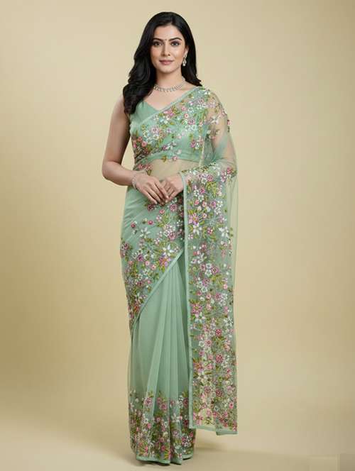 Colour : Pista, Made from high-quality Net Fabric Embroidred Saree, giving the saree a stunning look and feel.With a length of 5.25 meters and an additional 0.80 meters of Banglory unstitched blouse material.Available in various colors, this saree is perfect for weddings, parties, and other special occasions.Please be aware that screen settings or photography lighting may cause tiny variations in the product's colour, and that any additional accessories displayed are solely for modelling.