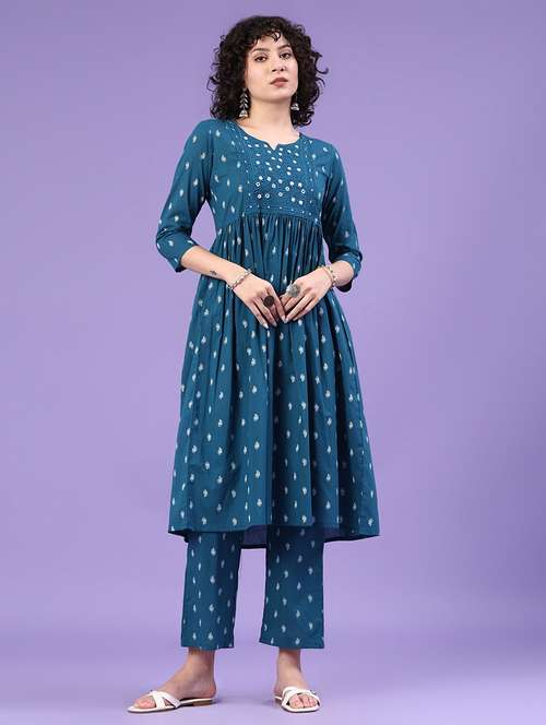 - Find gorgeous sets of ethnic wears in trending designs in teal colors suitable for casual wear of occasions.